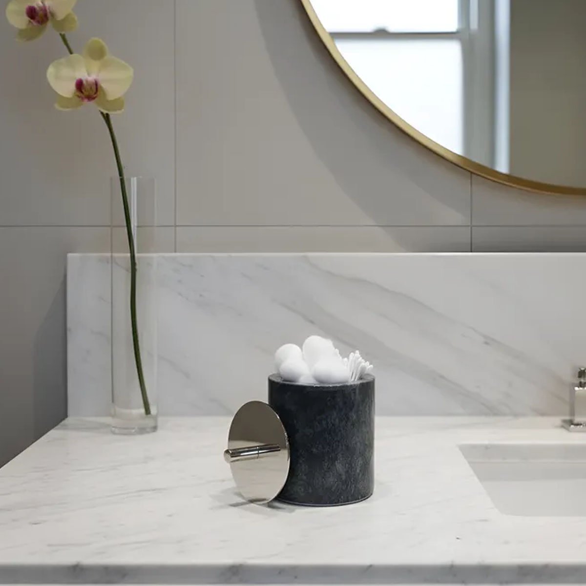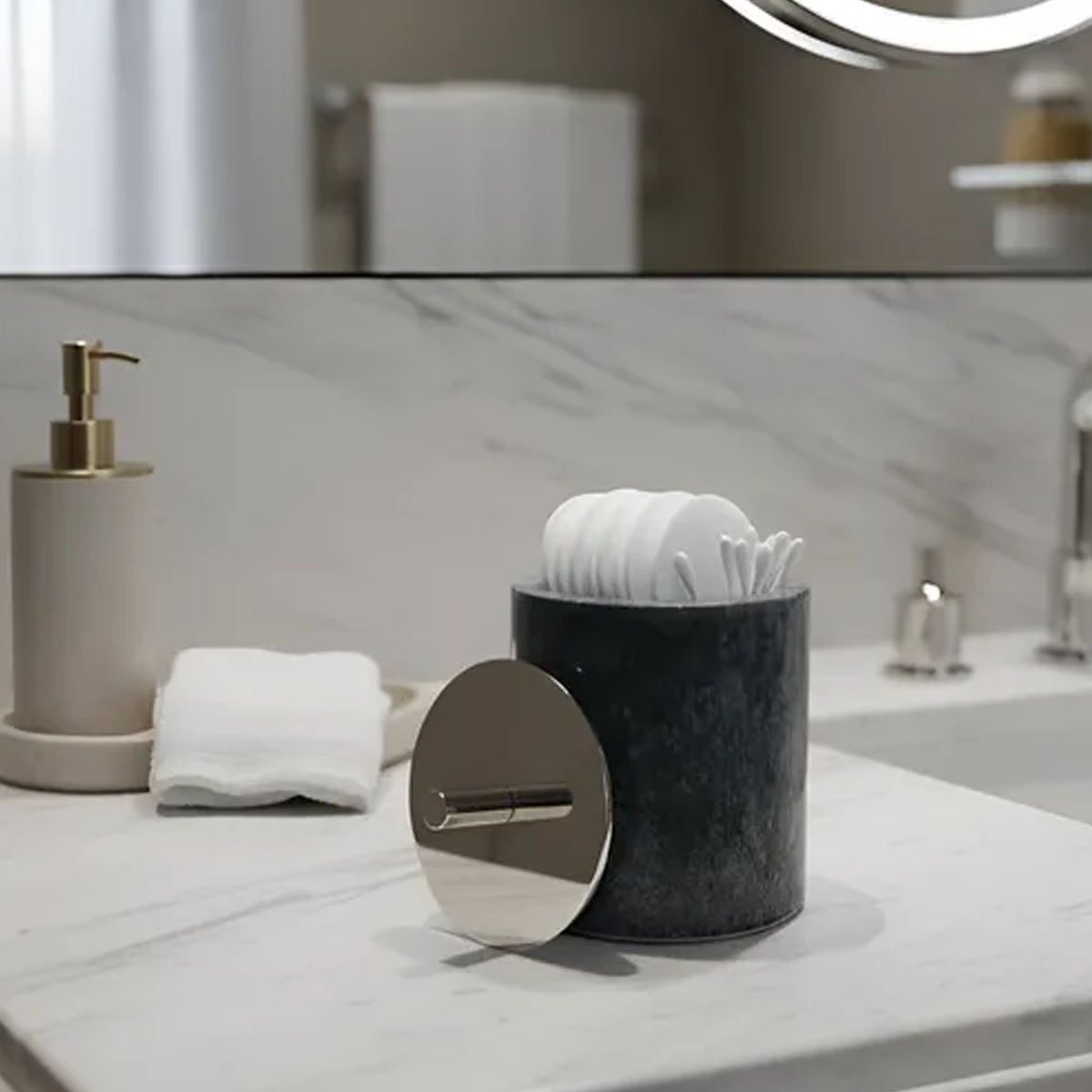 Algodonera de piedra de mármol negro. Todo el estilo que necesitas para tu baño en este set. Resistente y combinable con todos los ambientes. Material resistente, aporta belleza y ayuda a mantener el orden en tu baño.