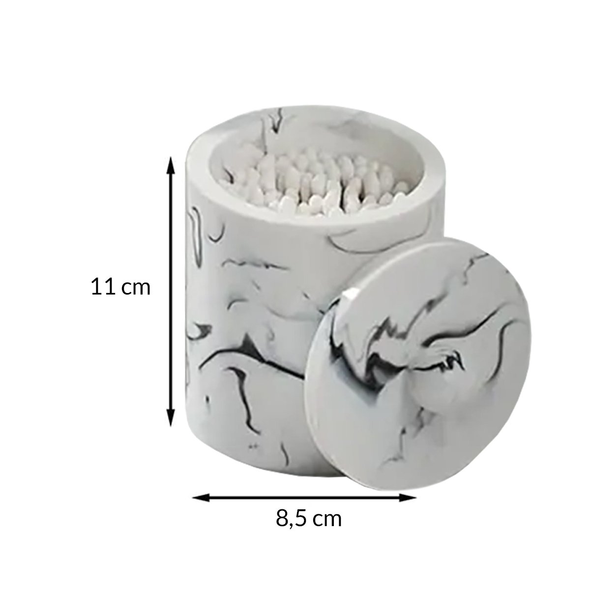 Algodonera de resina símil mármol blanco. Todo el estilo que necesitas para tu baño en este set. Resistente y combinable con todos los ambientes. Moderno en resina blanca con textura marmolada. Material resistente, aporta belleza y ayuda a mantener el orden en tu baño.