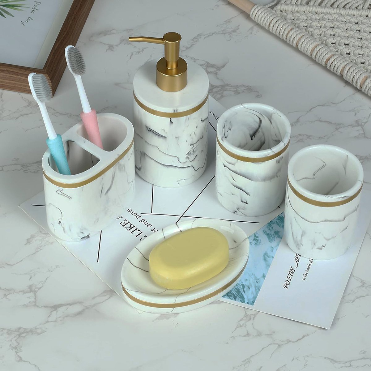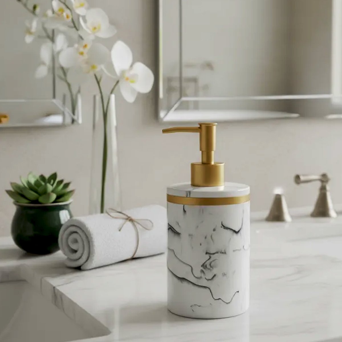 Dispenser de resina simil marmol con detalle en dorado. Todo el estilo que necesitas para tu baño en este set. Resistente y combinable con todos los ambientes. Moderno en resina blanca con textura marmolada. Material resistente, aporta belleza y ayuda a mantener el orden en tu baño.