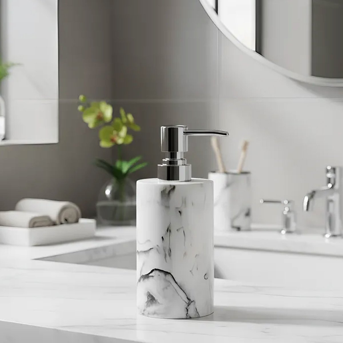 Dispenser de resina símil mármol blanco cilíndrico. Todo el estilo que necesitas para tu baño en este set. Resistente y combinable con todos los ambientes. Moderno en resina blanca con textura marmolada. Material resistente, aporta belleza y ayuda a mantener el orden en tu baño.