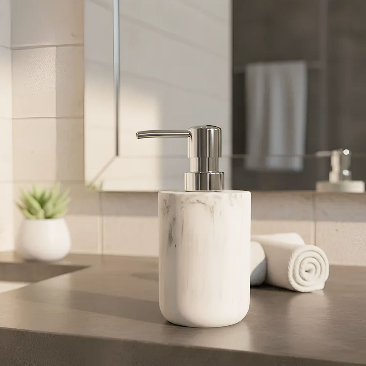 Dispenser de resina símil mármol blanco cilíndrico con textura opaca. Todo el estilo que necesitas para tu baño en este set. Resistente y combinable con todos los ambientes. Moderno en resina blanca con textura marmolada. Material resistente, aporta belleza y ayuda a mantener el orden en tu baño.