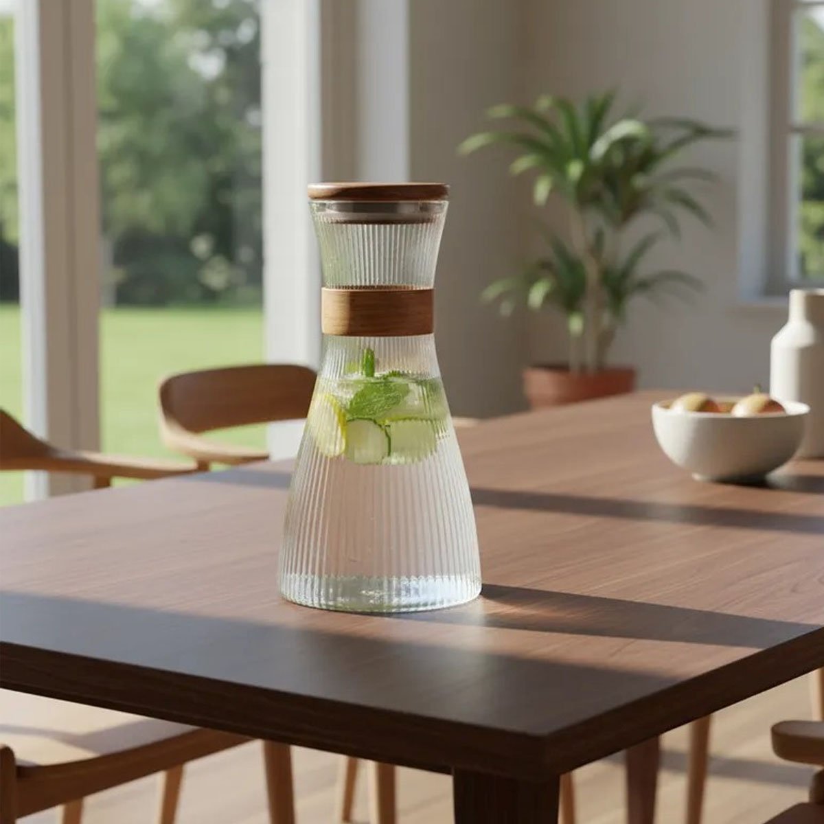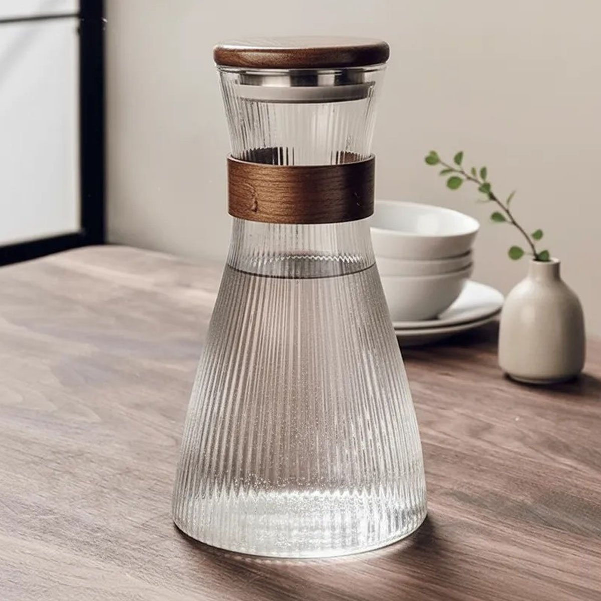 Su diseño combina la pureza del vidrio con el cálido detalle de la madera, presente en la banda central y la tapa, que protege tus bebidas y aporta un toque distintivo.