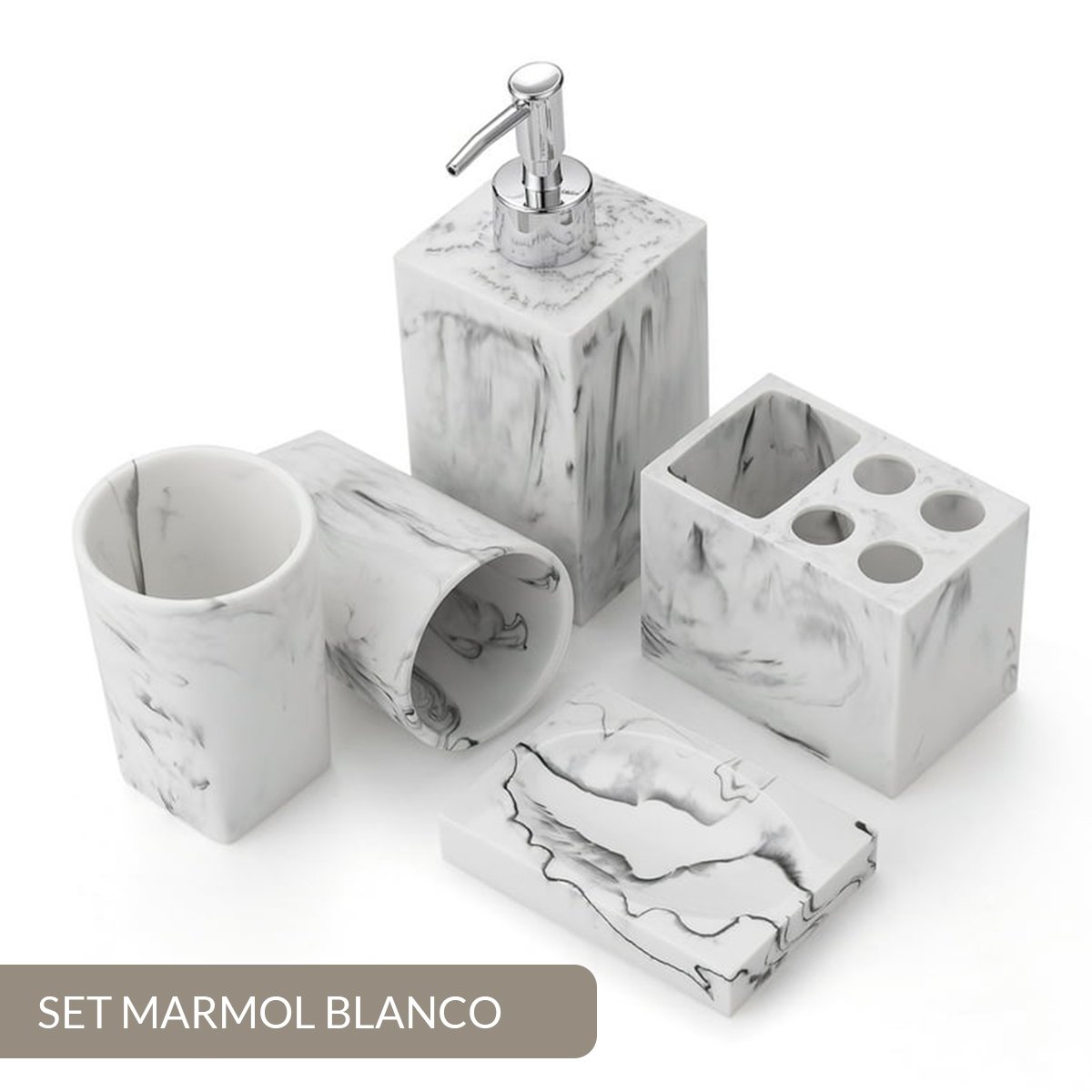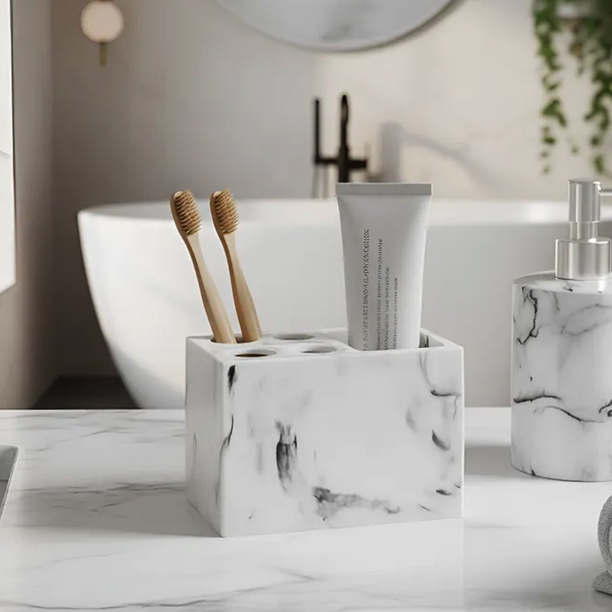 Porta cepillo de resina símil mármol. Todo el estilo que necesitas para tu baño en este set. Resistente y combinable con todos los ambientes. Moderno en resina blanca con textura marmolada. Material resistente, aporta belleza y ayuda a mantener el orden en tu baño.
