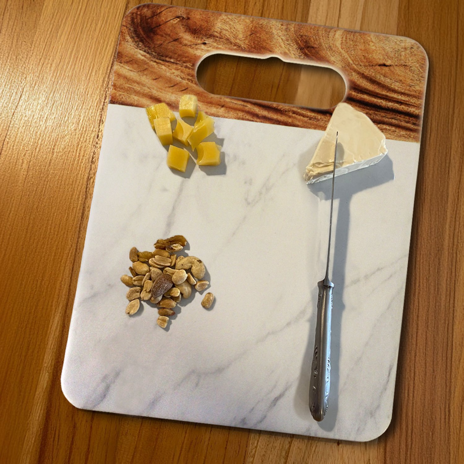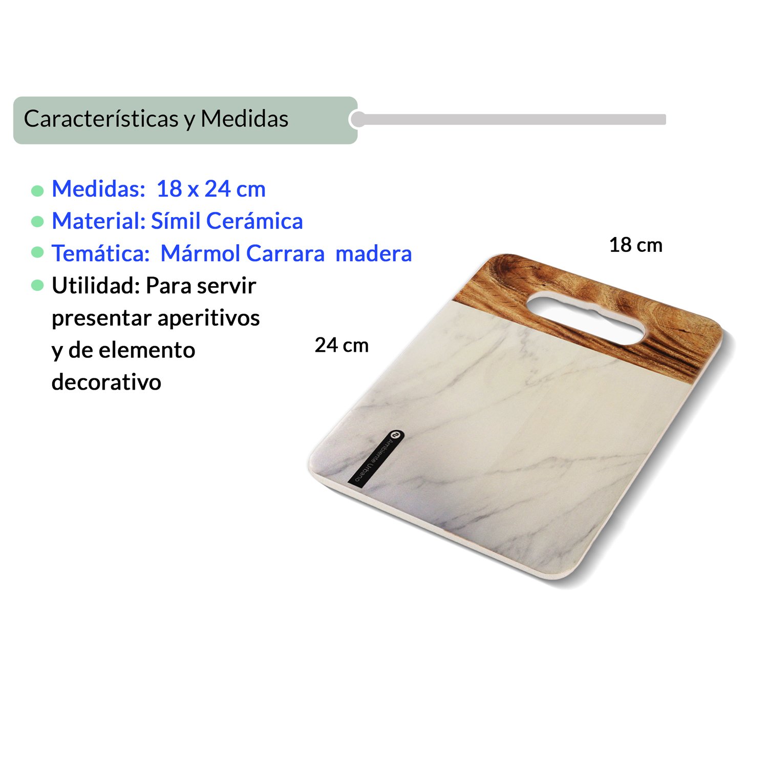 Dale un toque sofisticado a tu cocina o mesa con esta elegante tabla de símil cerámica, que combina el clásico diseño de símil mármol de Carrara con detalles de vetas tipo madera. Su estética moderna la convierte en una pieza ideal tanto para el uso funcional como para la decoración.