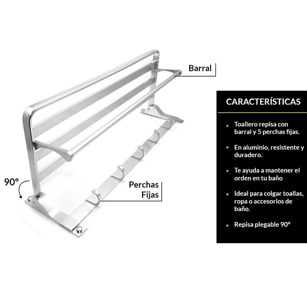 Optimiza tu baño con este toallero de aluminio de alta calidad, diseñado para brindar máxima funcionalidad y estilo moderno. Su estructura resistente y liviana permite un secado eficiente de las toallas, mientras que sus 5 ganchos son ideales para colgar batas, esponjas o accesorios de baño.