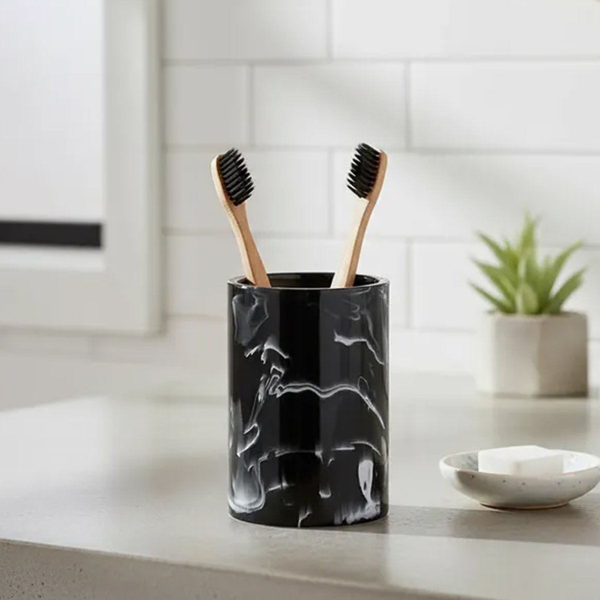 Vaso porta cepillo de resina símil mármol negro cilíndrico. Todo el estilo que necesitas para tu baño en este set. Resistente y combinable con todos los ambientes. Moderno en resina blanca con textura marmolada. Material resistente, aporta belleza y ayuda a mantener el orden en tu baño.